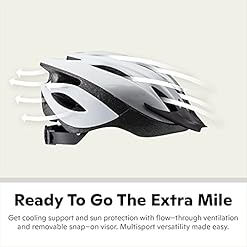Stay safe while cycling with the Schwinn Thrasher adult bike helmet. The Thrasher is comfortable in any weather, with 21 integrated flow vents and moisture-wicking pads to keep you dry. To ensure a secure fit, the helmet includes a Dual Fit adjustable design and easy-to-adjust webbing. And riders will love the built-in visor, which provides increased shade while riding.